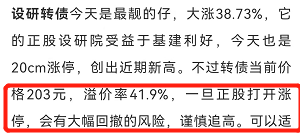 设研和岱勒转债分别是昨天的龙一和龙二,不过今天设研正股上涨7.9%,而设研转债却下跌10.44%,就是消化昨天过高的溢价率,正如昨天的文章提醒: