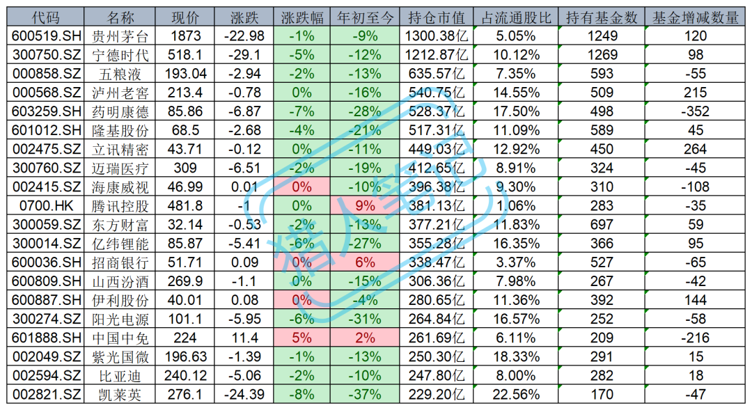 盘后我拉了一份基金重仓股的今年业绩表现,其中前20名个股中只有3只股票上涨,最大跌幅37%: