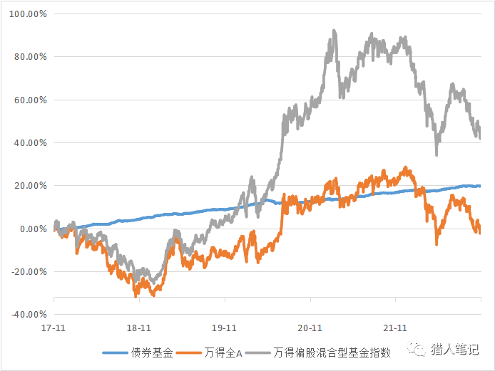 如果觉得今年以来的行情太短不具代表性,我们可以进一步拉长时间。从近5年的维度来看,在巨幅波动的市场里,债券基金指数没有那么折腾,走势宛如一条绵延向上的线,虽然累计收益低于偏股混合型基金指数,但明显跑赢了万得全A。
