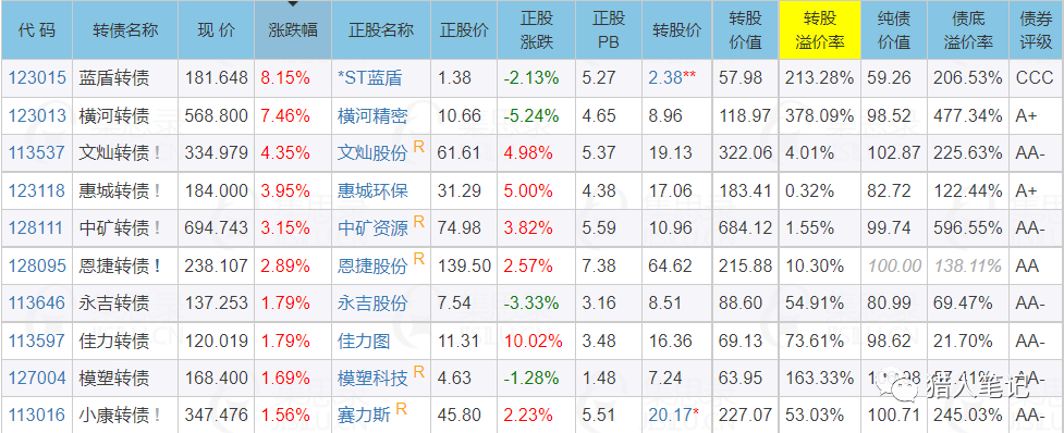 466只转债中44只上涨,占比9%,涨幅不低于1%的转债有16只,涨幅前10名如下: