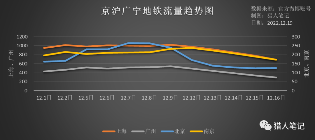 今天受到群友的启发,我统计了一下北京、上海、广州和南京四个城市的地铁出行数据,来看一下当前的疫情发展的影响。