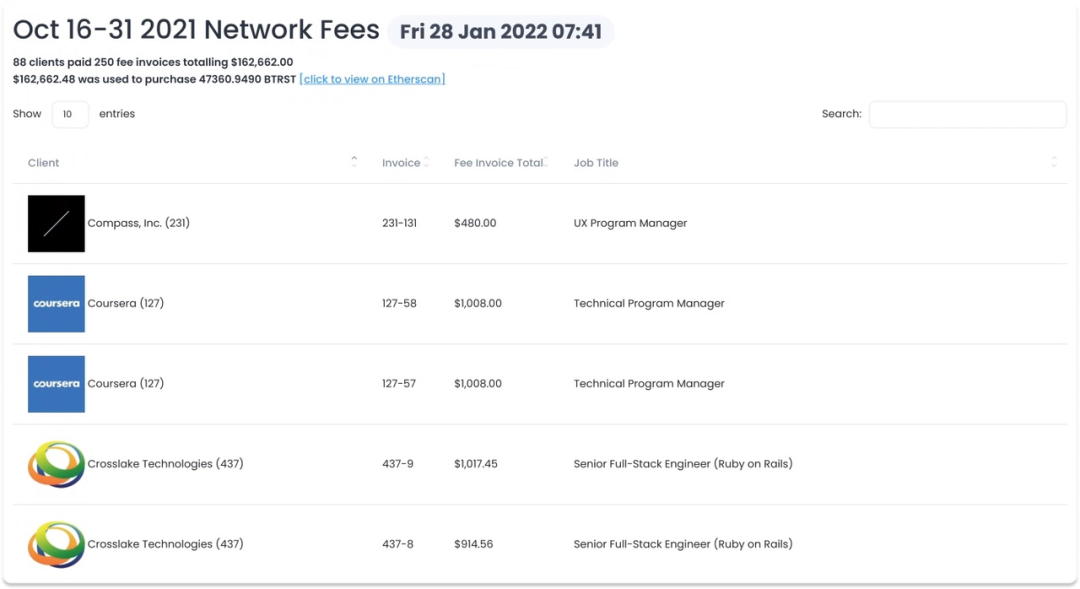 btrstinfo.xyz 费用查看器是最典型的代表,任何人都可以通过这一工具来查看平台的客户支付了多少钱、何时以及为什么工作,即时 Braintrust 平台上的工作详情页,也可以是 Braintrust 的收入明细。接下来 Braintrust 还将推出一个 Twitter 机器人,它会在推特上发布诸如“Nike 刚刚支付了 1,000 美元的发票,并购买质押了300 个 BTRST 代币”之类的推文。