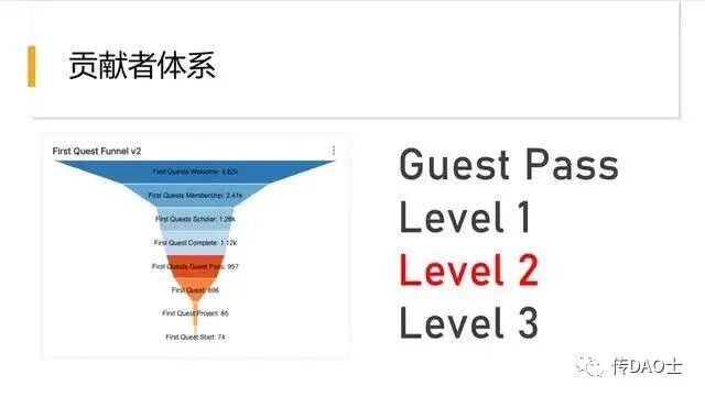 在DAO的实践中,大部人贡献者不是从第一天就被认定的,而是类似于一个游戏中的升级过程。这个过程也叫贡献者历程。也就是一个人从不了解DAO,到在社交媒体潜水,再到与其他成员建立联系,最终做出第一次贡献的过程。