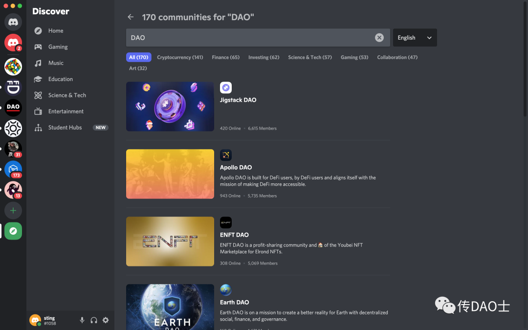 以上这些因素,让Discord目前成为了DAO的主要协作工具。搜一下关键词“DAO”就能找到170个公共社区。