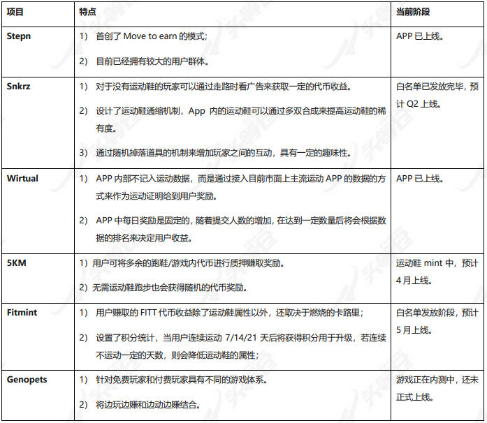 目前市面上主打“Moveto earn”的项目主要有Stepn、Snkrz、Wirtual、5KM、Fitmint、Genopets等。