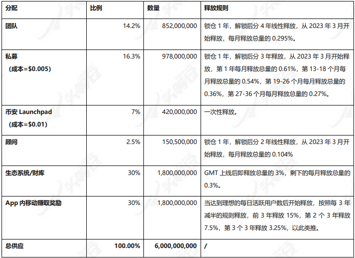 (注:GMT上线后,2月23号前符合条件的老玩家总共得到了总量的0.75%的代币空投,该部分空投来源于生态系统释放的部分。)