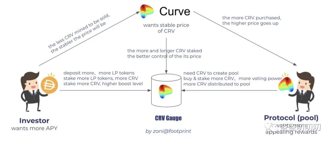 Curve平台的价值代币是CRV,CRV的持有者可以将CRV锁仓到Curve DAO 中以获得参与投票和治理的veCRV代币。只有持有veCRV的用户才能获得Curve流动性池产生的部分手续费,以及可以参与投票,决定哪一个流动性池未来可以释放更多的CRV奖励——APY更高的池子,自然会吸引更多的LP资金前来质押,更多的LP资金也就意味着更好的深度,滑点更低的兑换,最终正向激励投资者、协议方和Curve等,实现共赢。