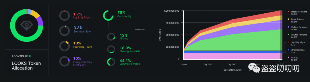 上图,是LooksRare向他的投资者和用户展示未来代币的供应和分配规则一览图,算是一种典型万金油的设计思路。一般情况,供给和分配对象大体上可以分成以下几类角色: