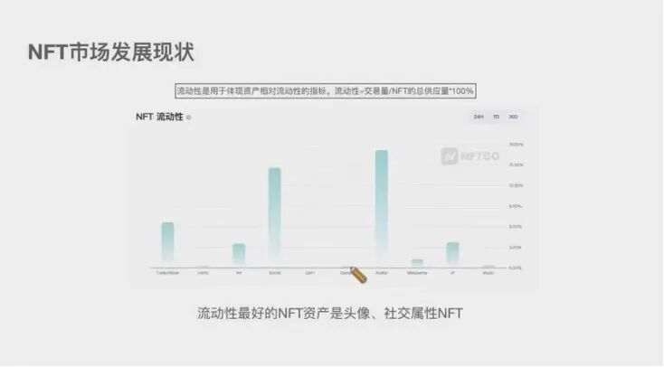 就目前现状而言,NFT市场仍处于早期阶段,NFT的交易量、市值占比较大的依然是集中在头像、收藏品、游戏和艺术四个方面。其中,头像类是交易最为活跃的NFT产品,极具社交属性的头像类NFT在市场上表现出的最优流动性,也就意味着NFT仍是一个模因(meme)市场。