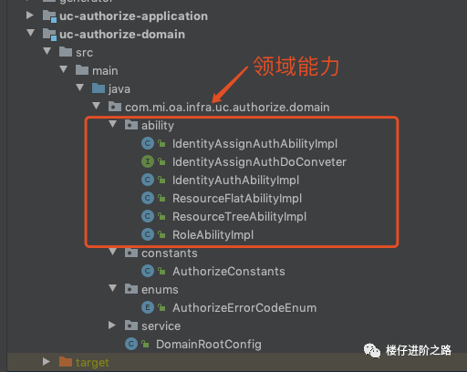 我们其实可以把领域服务再进一步抽象,可以抽象出领域能力,通过这些领域能力去构建应用层逻辑,比如账号相关的领域能力可以包括授权领域能力、身份认证领域能力等,这样每个领域能力相对独立,就不会全部揉到一个文件中,下面是实际项目的领域层截图: