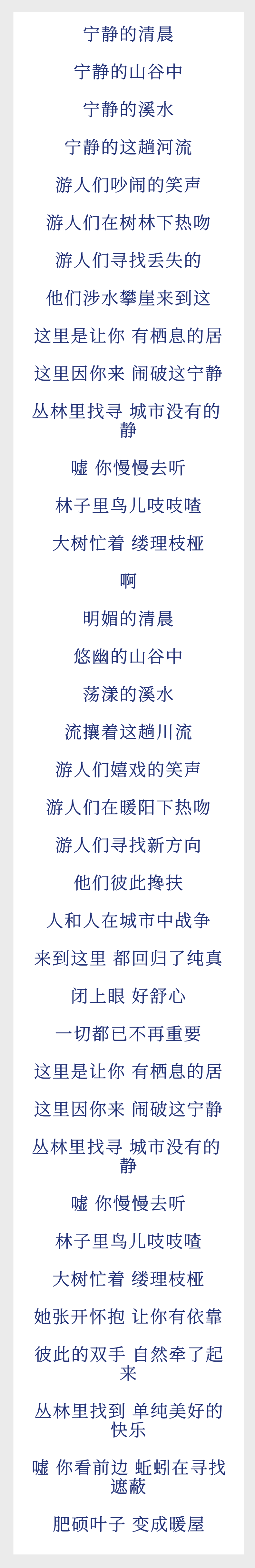 有没有一个瞬间,让你想远离城市,回归森林?这位歌手的原创作品一直根植于自然天地,从自然中汲取能量和灵感,歌曲仿佛带我们进入到了她的森林世界,远离城市的喧嚣,与自然为伴,更展现了人与自然和谐相处的美好画面。我们在城市里四处张望,内心有时难免居无定所。而森林慷慨地张开怀抱,包容我们的繁杂和忧虑,绿树忙着缕理枝桠,肥硕叶子卧成暖屋,在森林的荫蔽中,我们获得了平静的力量,抚平无处安放的灵魂。