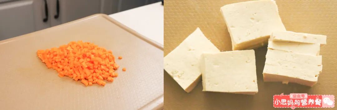 胡萝卜切小丁。豆腐切成薄片,一片差不多0.5cm厚就可以了。