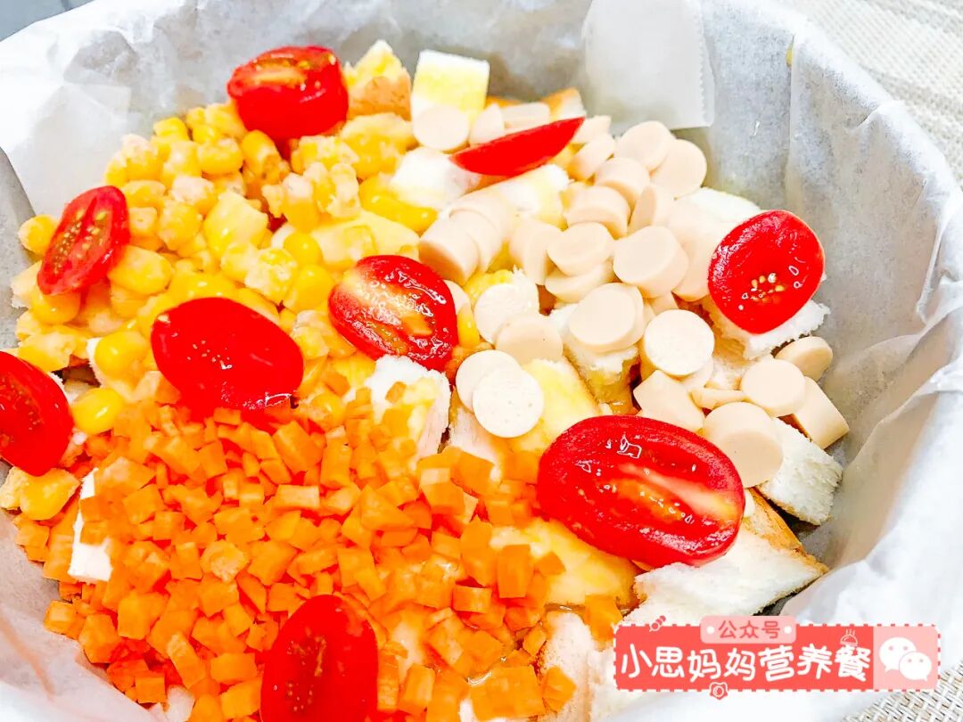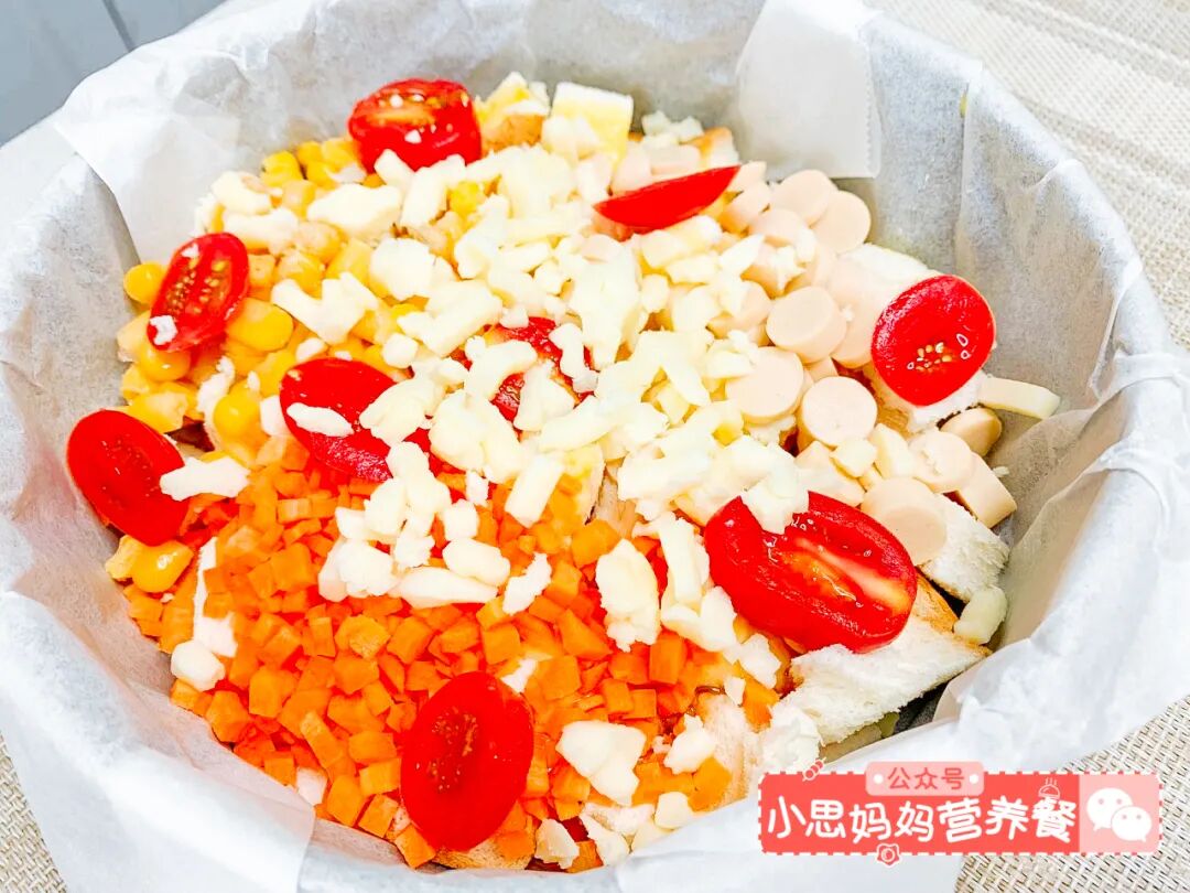tips:大家在家做的时候,要把食材混合均匀撒进去,这样宝宝吃到的每一口,都是丰富的~