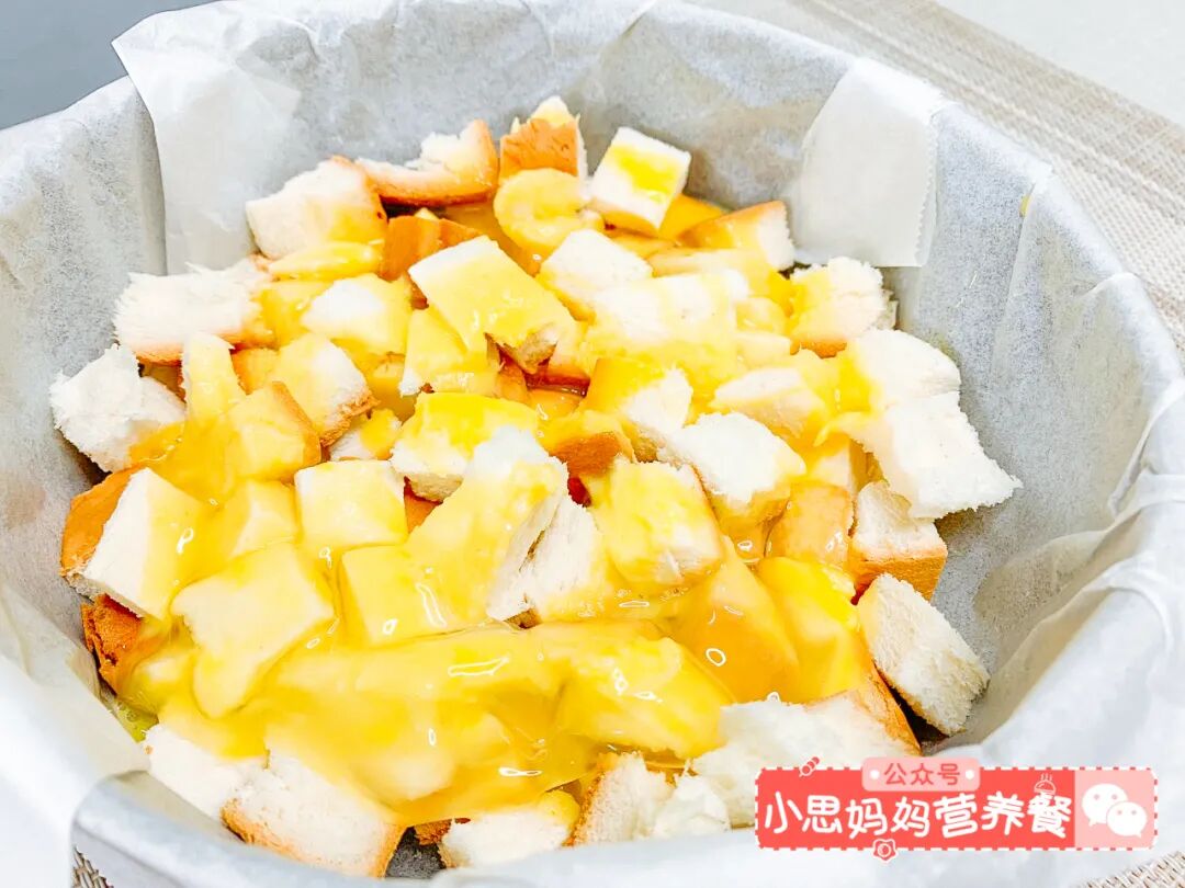 模具中铺上烘焙纸,放入吐司块,撒上蛋液。