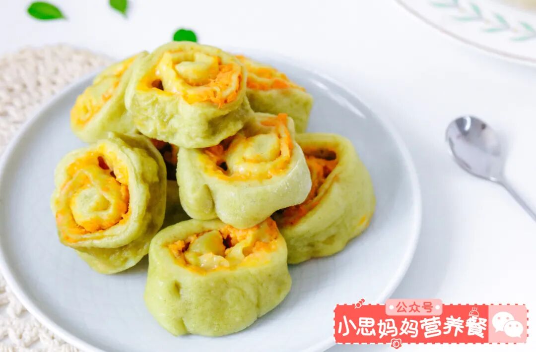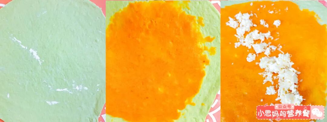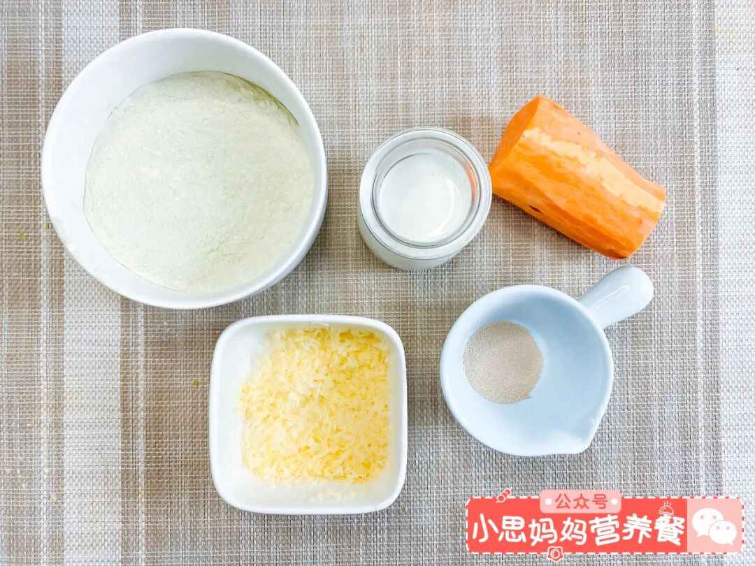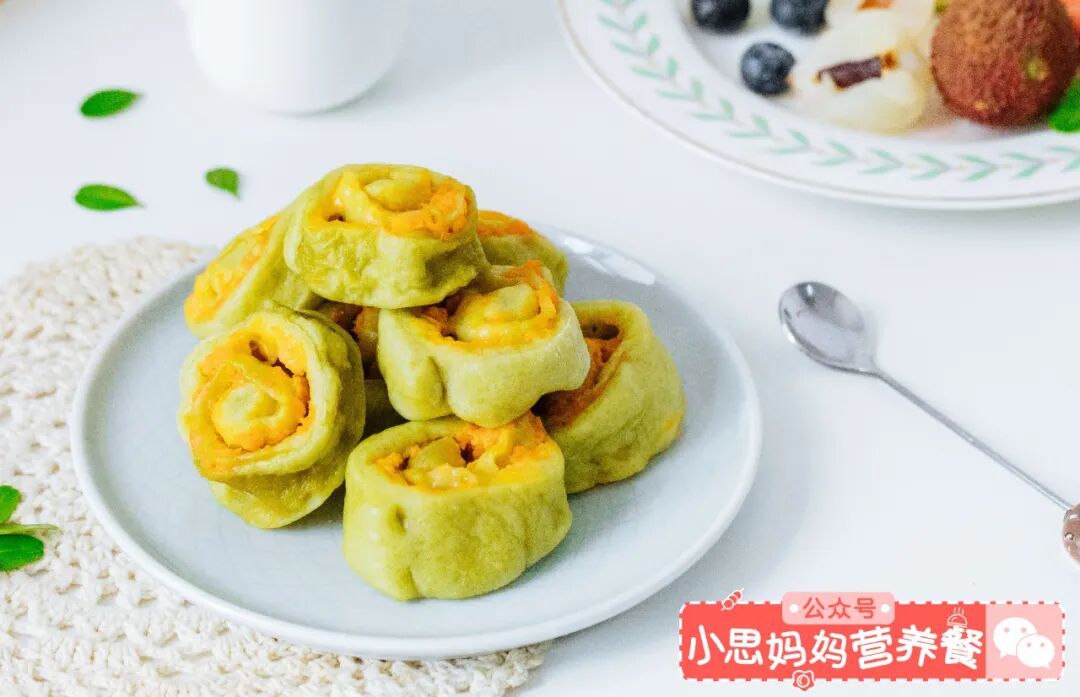食材:菠菜面粉100克、牛奶40克、酵母1克、红薯45克、奶酪碎25克
