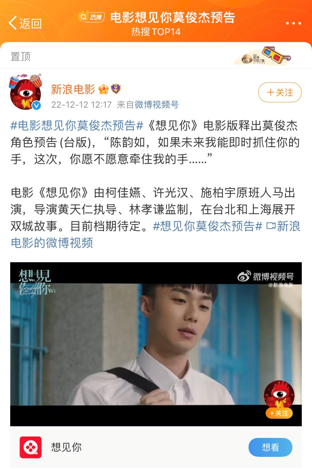 电影版《想见你》今日发布莫俊杰角色预告,到底什么时候定档啊?!