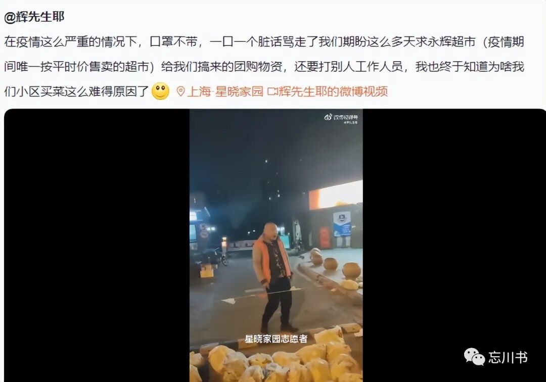 一个叫永辉超市的大商超,坚持按照平时价售卖食品,即使突破重重阻力把菜运到小区,依然被威胁辱骂殴打,不得不离开。