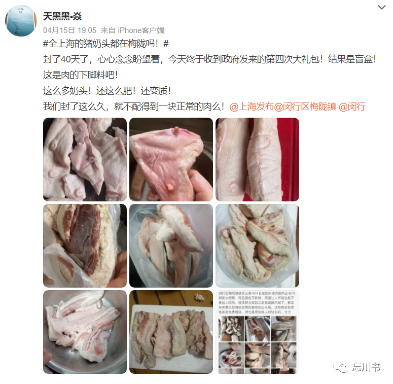 封控期间上海有市民反馈收到的肉变质了,闻着都臭了,肉上面居然还有奶头,看上去大都是边角料。当地防控办赶紧在官微上发说明,表示情况基本属实,已经叫停了该批物资的发放,还特意强调涉事企业“具有相关资质”。