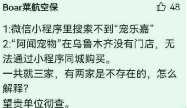 前几天,乌鲁木齐发布会上公布了三家宠物用品保供单位。