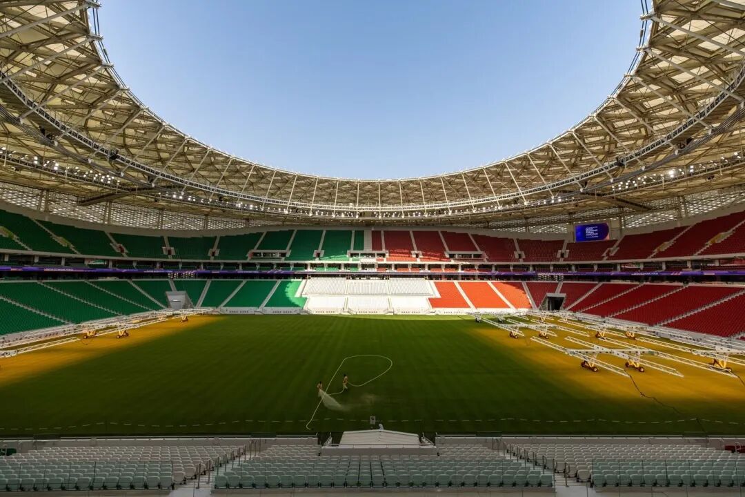 图说:场地工作人员在卡塔尔多哈的 Al Thumama 足球场的草坪上浇水