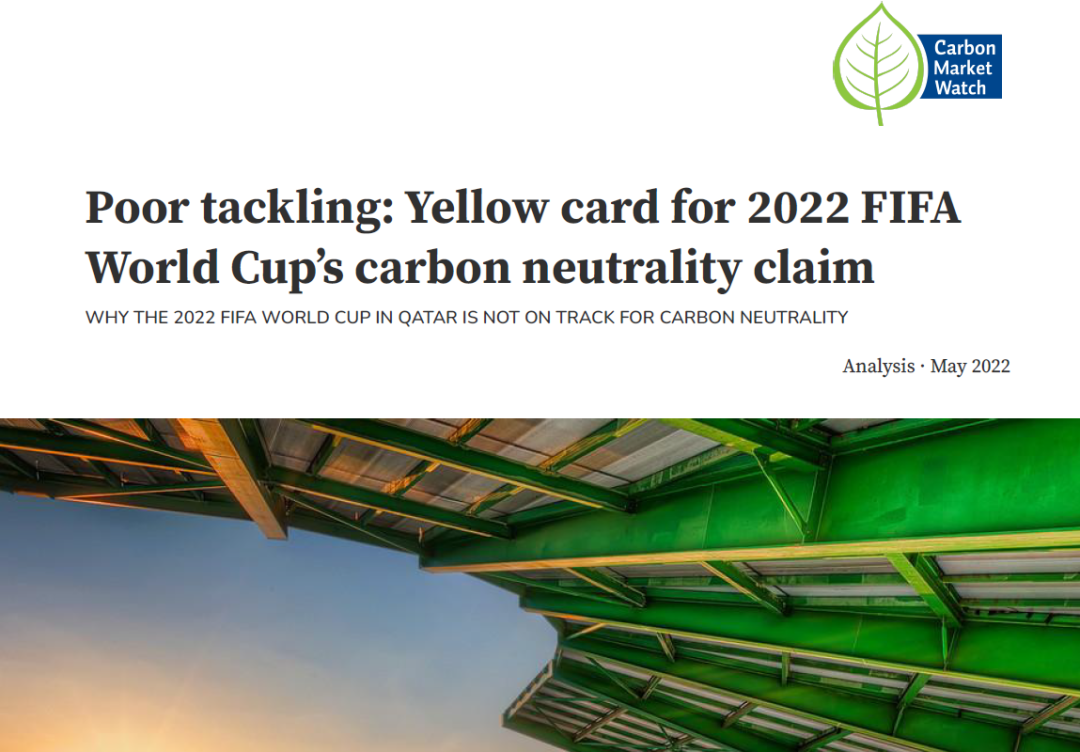 2022年5月碳市场观察(Carbon Market Watch)审查了卡塔尔世界杯温室气体排放报告,并发布了质疑报告《2022 年FIFA世界杯碳中和声明的黄牌》。该报告的主要执笔人吉勒斯·杜法司勒(Gilles Dufrasne)表示:“碳中和的承诺绝不可信,这是一个公然‘漂绿’的行为。”