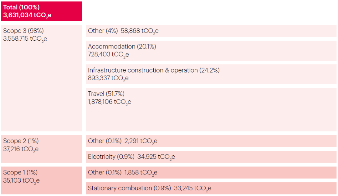 根据组委会还发布的2022世界杯温室气体排放报告,从2011年4月至2023年6月的筹备、赛事和赛后三个阶段,本届世界杯报告期温室气体排放总量估计为363万吨二氧化碳当量。其中大部分(98%)是间接排放(范围3,356万吨二氧化碳当量),主要来自于卡塔尔的比赛参加者,包括普通公众、官员和工作人员的旅行。