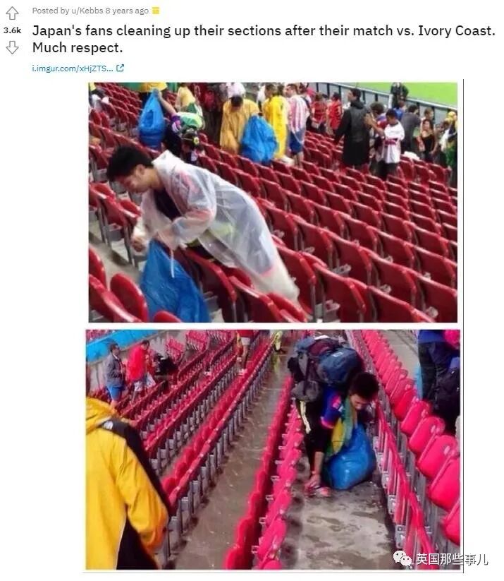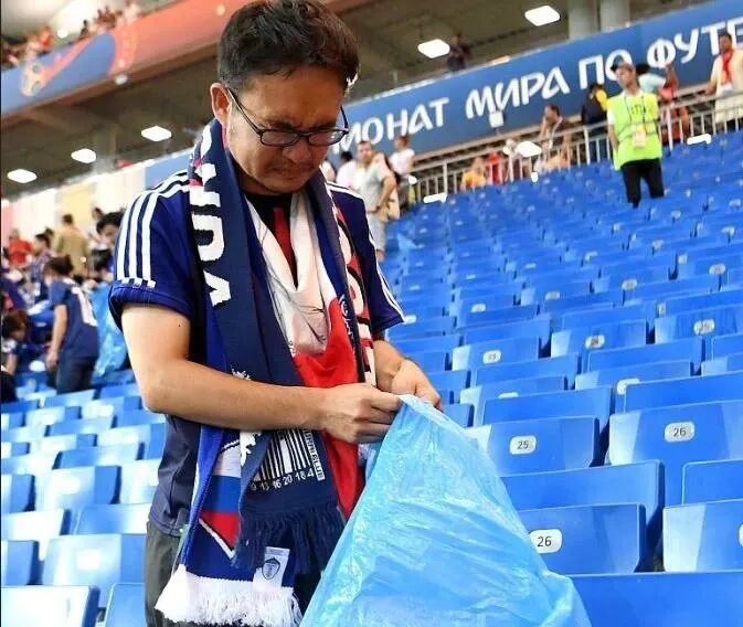 而在比赛结束后,人潮散去之后,刚才还在欢呼雀跃的身穿日本国旗T恤衫的球迷们却留下来捡拾留在看台上的瓶子和垃圾包装袋。而且看台上只要日本球迷分布的周围,他们也都在做着同样的事情,一些日本球迷甚至逐排查看,以确保没有垃圾被遗留下来。