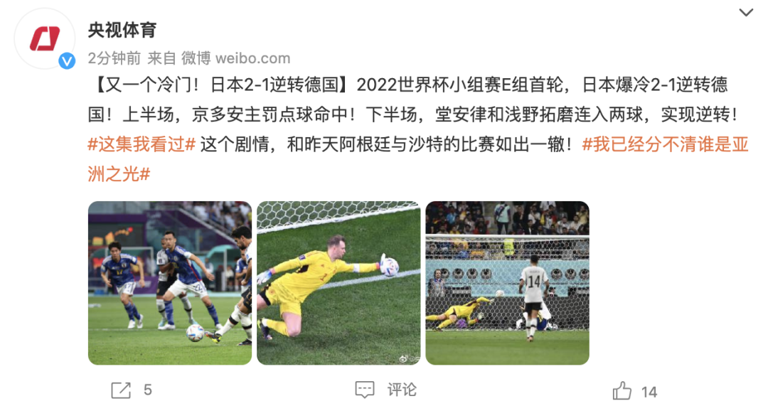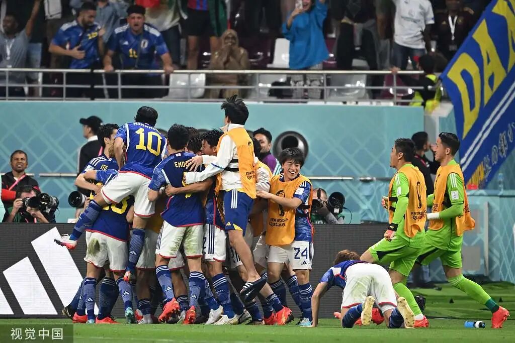 2022世界杯小组赛E组首轮,日本爆冷2-1逆转德国!上半场,京多安主罚点球命中!下半场,堂安律和浅野拓磨连入两球,实现逆转!这个剧情,和昨天阿根廷与沙特的比赛如出一辙!当主裁判吹响全场结束的哨音时,日本队全队球员和教练如同夺冠一般冲入球场庆祝。![]()