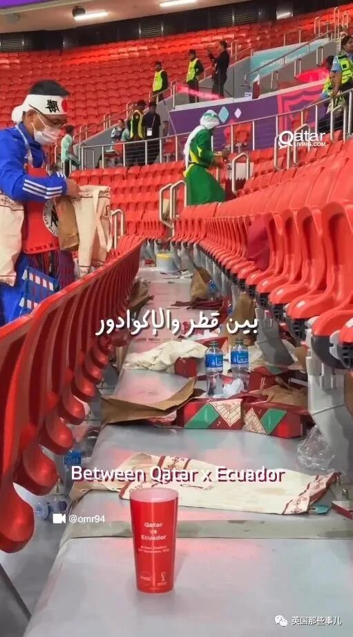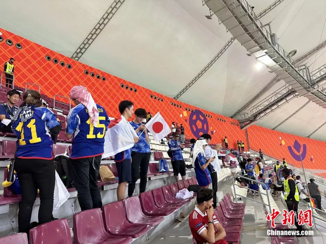比赛期间,卡塔尔球迷失望难过,有些人提前退场,厄瓜多尔球迷自然是欢呼雀跃。比赛结束后,观众散去,看台上留下不少瓶子、纸袋、包装盒等垃圾。但日本球迷留了下来。