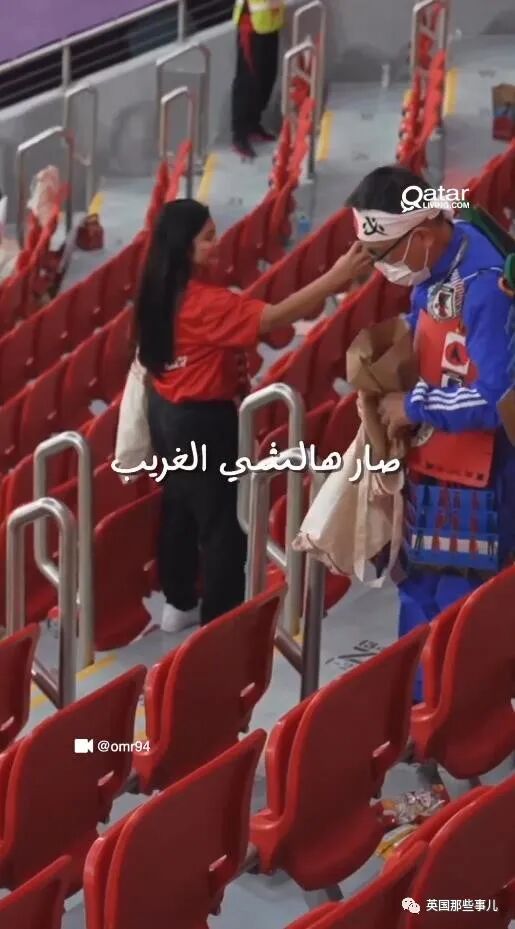 现场一位名叫 Omar Farooq 的巴林人博主拍下了日本球迷捡垃圾的这一幕,并将其发布在Instagram 上。视频发布仅6个小时,就获得了超过30万的点赞,大部分观众的评论都是对日本人表示了尊敬。