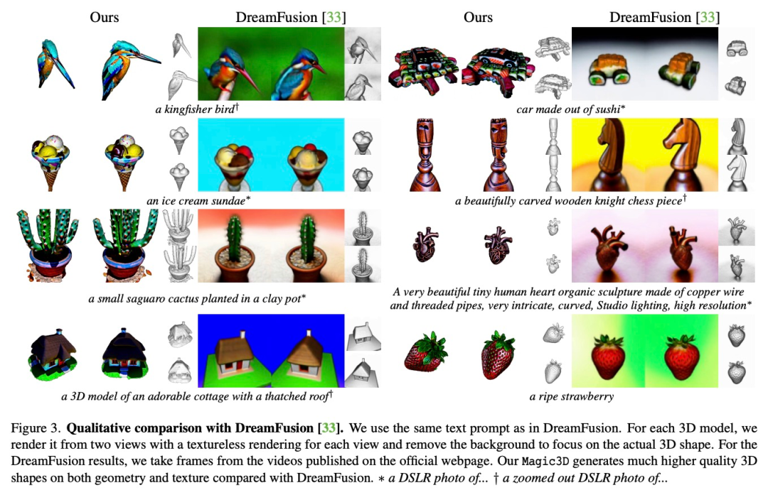 Stable Diffusion 的论文在 2022 年 8 月才首次提交,几个月就已经进化到这样的程度,不禁让人感叹科技发展的速度。英伟达表示,你只需要在这个基础上稍作修改,生成的模型就可以当做游戏或 CGI 艺术场景的素材了。3D 生成模型的方向并不神秘,其实在 9 月 29 日,谷歌曾经发布过一款文本到 3D 的生成模型 DreamFusion,英伟达在 Magic3D 的研究中直接对标该方法。![]()