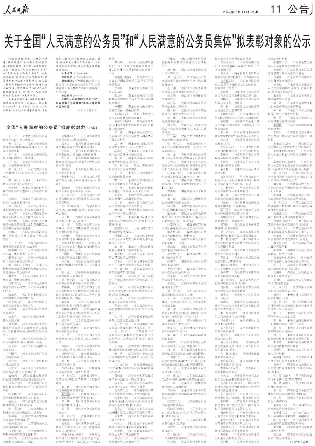 为表彰先进典型、弘扬奋斗精神,激励动员广大公务员奋进新征程、建功新时代,党中央、国务院决定表彰一批全国“人民满意的公务员”和“人民满意的公务员集体”。在各地区各部门(单位)广泛听取意见、开展考察和评选推荐的基础上,经表彰工作领导小组办公室评审、领导小组会议审议,研究提出了397名“人民满意的公务员”和198个“人民满意的公务员集体”拟表彰对象。