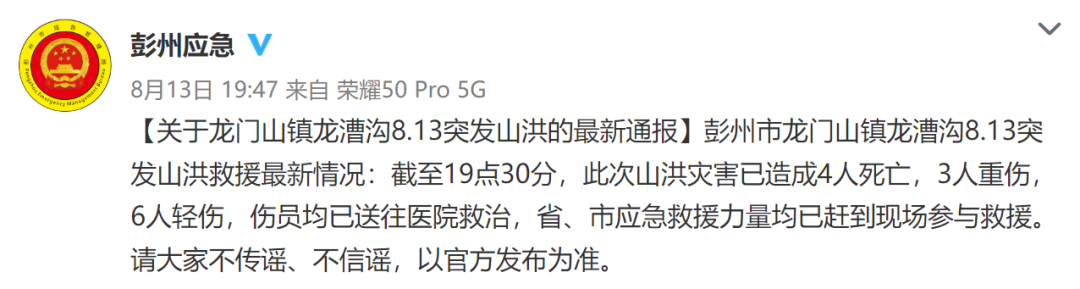 8月13日14时35分,彭州市气象台发布短时天气预报称,龙漕沟所属的龙门山镇等地有对流云团生成并发展,“预计未来6小时我市上述镇及其周边地区有阵雨或雷雨,并伴有短时强降水”。据上游新闻,多名在龙漕沟附近宝山村游玩的游客表示,当天下午当地确有降雨,但湔江河谷附近雨势不大,没有引起在龙漕沟游玩的游客注意。13日下午14时37分,彭州市龙门山镇接到气象预报,辖区有对流云团生成,将伴有短时强降雨。接报后,龙门山镇政府立即组织镇村(社区)干部、巡逻队员及志愿者等力量对辖区内河道沿线戏水游客进行劝离。15时30分,小鱼洞社区龙漕沟突发山洪,河道未撤离游客被卷入山洪。事故发生后,彭州市应急管理局、公安局、消防大队等部门立即赴现场开展搜救工作。随后,彭州市应急管理局再通报称,截至13日19点30分,此次山洪灾害已造成4人死亡,3人重伤,6人轻伤。