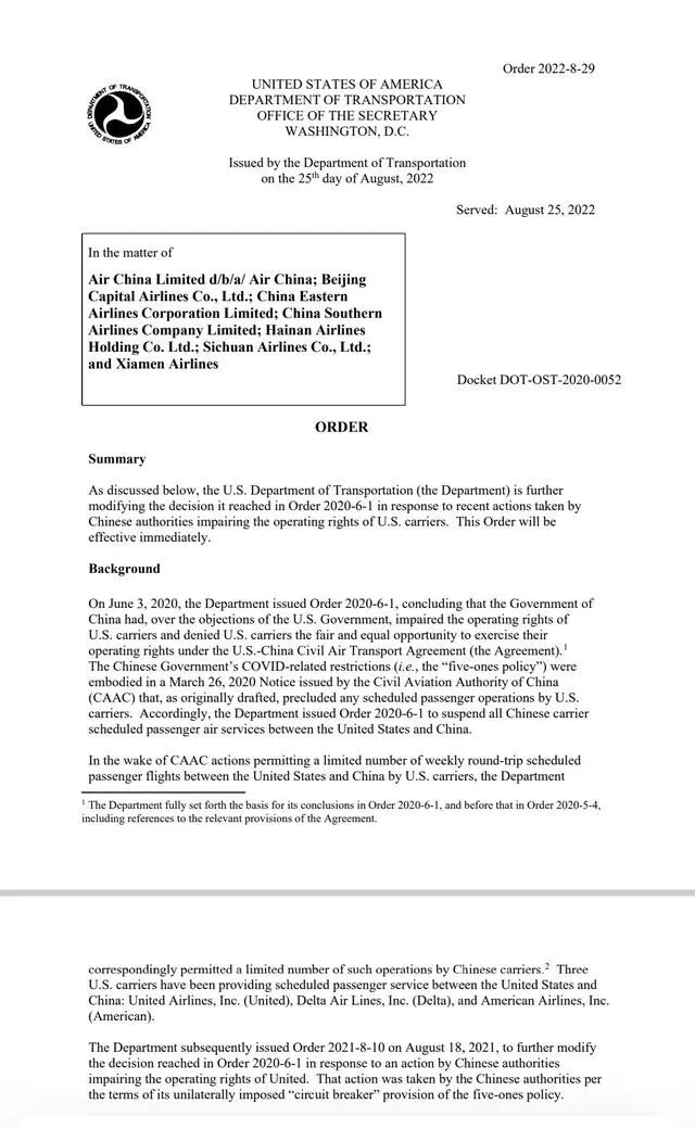 当地时间8月25日,美国交通部发布通告,由于美国航司多个赴华航班被取消,计划自九月起取消26个由中国航司(国航、南航、东航、厦航)承运的美国赴华航班。