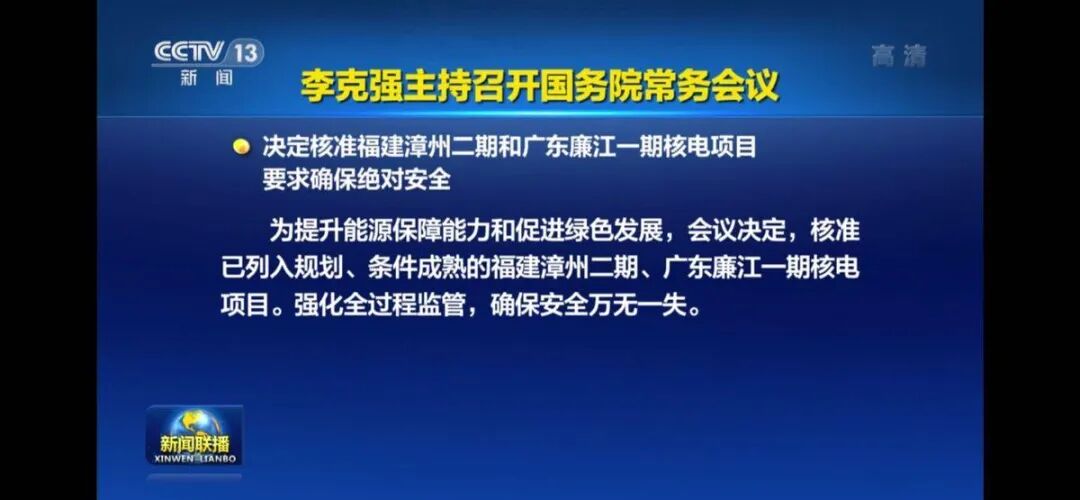 为提升能源保障能力和促进绿色发展,会议决定,核准已列入规划、条件成熟的福建漳州二期、广东廉江一期核电项目。强化全过程监管,确保安全万无一失。
