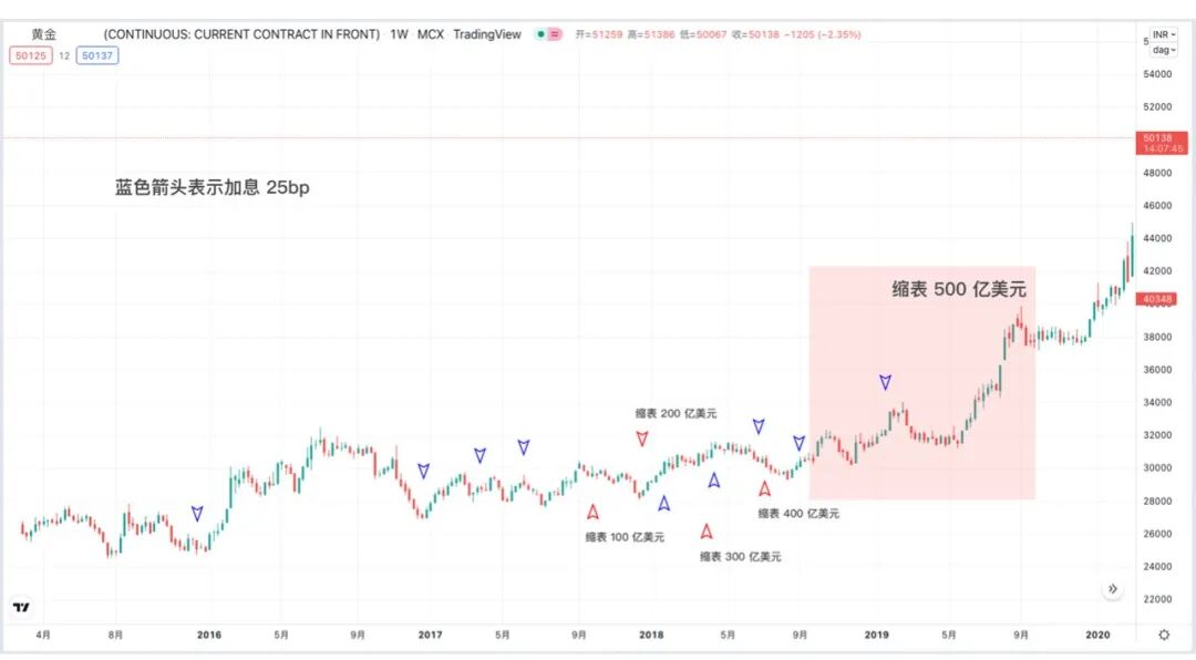 由于黄金与美元存在一定程度的挂钩,因此在上一轮紧缩周期中,黄金亦呈现出偏震荡走势。