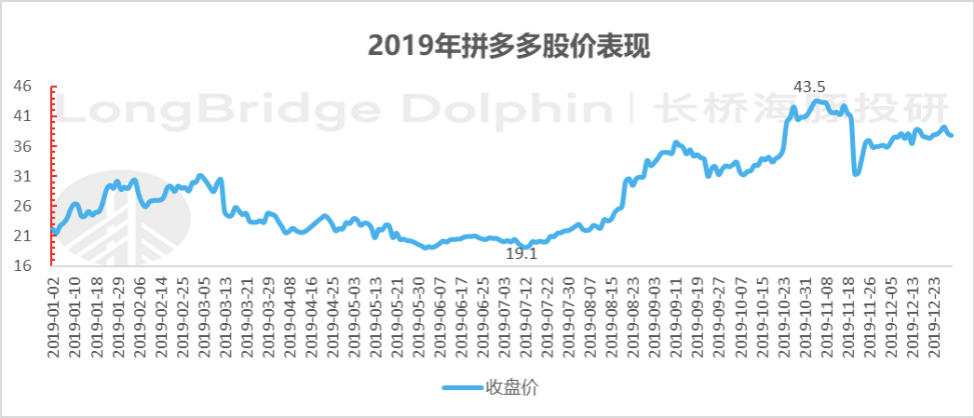 我们知道,拼多多2018年7月以每股19元的发行价登陆纳斯达克,海豚逐年来看股价表现: