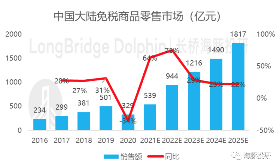 资料来源:公司公告,海豚投研毛利率方面,与普通的零售业态不同,免税店可向品牌供应商直接采购,除了收税优惠,还免去中间环节产生的许多费用,所以免税运营商的毛利率要高于一般零售企业,免税业务的毛利率也显著高于有税业务。尤其是公司在收购拥有规模优势的日上中国、日上上海后,免税业务毛利率提升至50%+,显著高于有税业务的25%-35%。2020年疫情之下,公司整体毛利率下降至40%,一方面是因为去年海南的门店打折促销活动多且折扣大,导致免税业务的毛利率同比下降至45%,另一方面是线上有税业务占比提升,拉低了整体毛利率。近年来国人购买力不断增强已是不争的事实,中国人的消费成为全球奢侈品消费增长的主要力量。根据中国产业信息网,中国人奢侈品消费约占全球奢侈品消费的三分之一。但由于大量奢侈品均为国际品牌,加之关税的影响,同样的奢侈品在中国专柜渠道的价格一般大幅高于国外,因此我国奢侈品消费外流严重。根据观研天下,我国国人仅有不到30%选择在国内购买奢侈品,超过70%的奢侈品消费均外流至国外。但随着2020年疫情的到来,国人境外消费受到限制,无处安放的奢侈品购买力自然开始更多地留在国内。奢侈品购买渠道主要包括国内专柜、免税店、跨境电商等。而免税商品,凭借价格优势和正品保证,便成了承接消费回流的最优选择。a. 据海豚投研测算,免税商品不需征收关税以及进口环节增值税和消费税,累计免税比例一般在30-60%。体现在实际售卖价格上,以不同平台具体商品到手价格来看,免税店价格要比品牌官网价格低出10%-30%不等。b. 免税店经营模式为公司统一向供应商采购免税商品后,品牌授权同时省去中间环节,与跨境电商相比,商品质量更能够得到保证。叠加旅游属性赋能,免税相比其他奢侈品购买渠道而言具有显著的优势,免税将成为消费回流的首要抓手。2020年6月29日,财政部等发布《关于海南离岛旅客免税购物政策的公告》自2020年7月1日起实施。与此前已有离岛免税政策相比,本次政策调整在购物额度、商品品类等方面调整力度之大史无前例:a. 提升额度:离岛旅客每年每人免税购物额度由3万元提高至为10万元,且不限次,取消单件商品8000元免税限额规定;b. 增加商品品类:增加部分3C、酒类、保健品等7种商品,离岛免税购物品类从38种增至45种;c. 大幅放宽单次购买数量限制:化妆品由12件放宽至30件,取消除化妆品、手机和酒类商品以外的购买数量限制。而国人显然对政府的好意颇为受用,自新政实施后,2020年下半年海南离岛免税销售额各月均实现了150%+的高增长。同时据海南省发言人,预计到十四五(2025年)海南有望吸引免税消费回流3000亿元,同时省委书记也表示到2022年离岛免税销售额目标为1000亿,到2030年为7000-8000亿,2020-2030年CAGR约为39%。综合以上两点,据贝恩咨询预测,到2025年国人境内奢侈品消费占比将从2019年的32%大幅提升至55%。而中国免税市场作为承接消费回流的主要阵地将是直接受益者。免税行业其实具有较高的进入壁垒,需要有牌照资质。牌照由国家集中统一管理、发放,具有稀缺性和一定的获取难度。目前中国仅有十张免税牌照。中国中免背靠国务院国资委,强大的央企背景给公司带来得天独厚的政策优势,一家就拥有了三张牌照,分别是中免集团、日上免税行、海南免税。公司也成为目前国内唯一拥有离岛、机场、市内、境外等全牌照免税资质的公司。另外七家公司虽然说都具有免税牌照,但各自的免税牌照所允许的经营区域并不相同。而可以在全国范围内经营免税业务的牌照运营商只有中免和中出服免税。但在去年年中,海南省财政厅、商务厅、市场监管局三方发布的公告中提到,将按照经营品牌、品种、价格和国际三同步的原则,采用招标等市场化竞争方式选择并确定新增加的海南离岛免税购物经营主体,申请将依规报财政部、海关总署、税务总局和商务部审核后按程序批准。也就是说,这就为想进入离岛免税市场的公司敞开了大门。目前,申请免税牌照的上市公司多达十余家,主要分为三类,包括百货零售业,如友阿股份、大商股份等;旅游企业,如岭南控股等,以及地产业,如格力地产等。随着更多的竞争者入局,中免还能否守住目前的绝对优势?海豚君认为,随着免税市场的逐步成熟,未来市场竞争较为充分的情况下,行业马太效应将会逐渐显现。因此中短期来看,考虑到中免庞大的市场份额和规模优势,国内免税市场的格局并不会有明显变化。而放眼长期,由于目前牌照开放仅局限于海南地区,在涌入玩家数量有限的情况下,中免在整个免税市场的龙头地位可能仍然不会受到威胁。不过若有关键玩家,如背后为阿里的银泰百货,入局的话,市场竞争加剧的结果可能是会拉低离岛免税行业整体的利润率。我们可以参照免税行业发展较久的韩国。2013年至今,韩国政府不断放开市内免税牌照限制,目前牌照数量已增加至超过60张。然而牌照数量的增加并没有打破免税市场高集中度的格局,2019年韩国三大免税巨头合计市占率超过80%,而中小型免税企业在政府扶持下经历多年尝试未能进入良性发展,最后集中在2019年纷纷撤店退出市场。那么造成这种局面的原因是什么呢?中国中免的护城河究竟是什么?其实免税行业本质上作为零售行业的一种业态,最重要的无外乎是人、货、场。如前文提到,免税消费