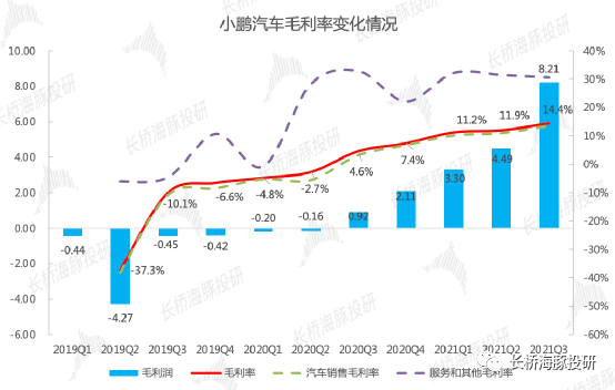 小鹏汽车业务结构简单,整体毛利率取决于汽车销售毛利率。2021年三季度小鹏汽车整体毛利率14.4%,环比二季度的11.9%提升2.5个百分点,超彭博一致预期13.4%。