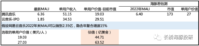 (4)社交娱乐业务未来增长仍然逃不开行业发展的大趋势。但云音乐相比同行,在付费率上仍然有提升空间,我们假设未来2025年付费率可以追平腾讯音乐目前水平,即5.6%,略低于斗鱼、虎牙的付费率。网易云音乐的社交娱乐用户渗透率较低,仅10%,而腾讯音乐这个数字是30%以上(社交娱乐用户有别的渠道流量转化)。但考虑到短视频在社交娱乐上的强势,再去做渗透难度还是比较高的。因此我们假设云音乐社交娱乐本身用户渗透率缓慢上浮至16%,但难以看齐腾讯音乐当前水平。也就是说,未来付费用户增长主要靠在线音乐引流后的内部转化。海豚君基于以上假设,预计2025年云音乐的总收入在227亿元人民币,年复合增速36%,略高于CIC预测的行业增速(在线音乐+社交娱乐)32%。稳态下按照腾讯音乐疫情前15%的利润率水平(乐观判断,因腾讯音乐中现金牛业务社交娱乐做得较好),给予18倍PE(2025年之后未来三年利润年复合增速假设为15%),则估值为613亿人民币,合95亿美金,按照13%的贴现率折现到2022年末,预计为66亿美金,较IPO估值约有20%的溢价空间。网易云音乐有其自己独特定位,在未来的数字音乐市场一定会有一席之地。短期在版权放松后,有望通过加速补齐头部版权内容而吸引更多的用户回到平台。- 1)数字音乐单纯付费市场空间着实不够大,国内用户的付费习惯需要一步步养成。云音乐目前的策略就是用低付费来换用户。