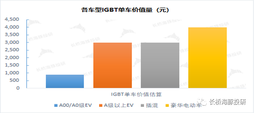 由于各级车型对功率要求不同,各车型的IGBT单车价值量也各有不同。一般A00级车的单车价值量相对较低,约800-1000元,A级电动车和插混单车价值量比较接近,约3000元左右;而豪华电动车单车价值量大多在4000元以上。