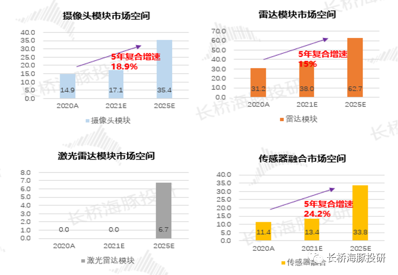 智能传感器的市场空间=摄像头模块+雷达模块+激光雷达模块+传感器融合