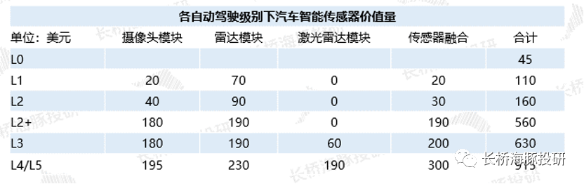 1)价格方面:参考上图中“各自动驾驶级别车型的传感器单车价值量”;