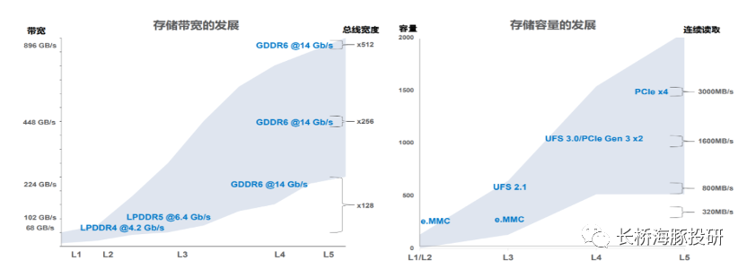 2)存储芯片容量方面:在L1/L2阶段,e.MMC类型存储基本能应对场景,而当进入L4场景时也将难以适用,更需要能连续读取1600MB/s以上的UFS 3.0和PCle。