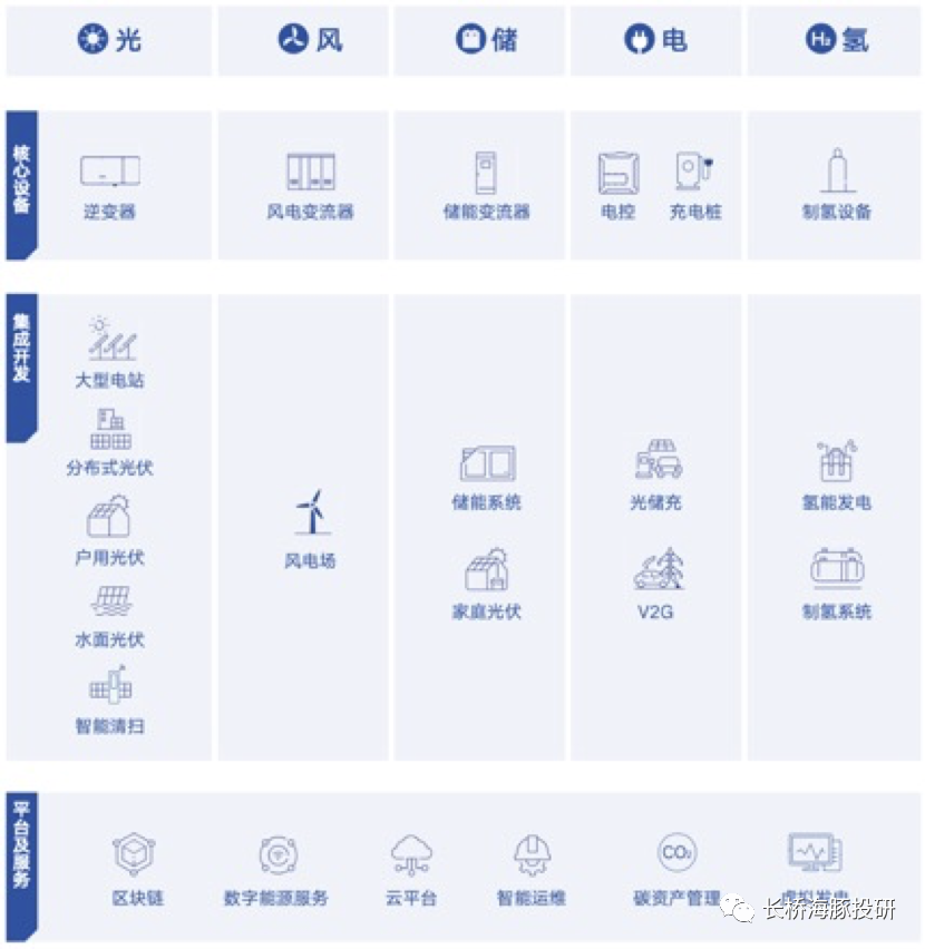 不过2022年光伏板块开年不利,公司股价已经回撤超20%。长桥海豚君将分上下两篇,尝试判断阳光电源的投资机会。1、阳光电源在广大股民心中贴的是光伏逆变器的标签,但初识阳光电源,公司业务范围不止于光伏逆变器,而是涵盖“风光储电氢”五大领域,妥妥地在新能源赛道撒了一张大网,走业业务多元化路线的公司,我们首先需要明确公司的业务重点和边际。2、公司所处的光伏、风电、储能等主赛道未来的空间和成长性几何?竞争格局如何?3、逆变器领域为何能走出光伏三剑客之一的阳光电源?逆变器业务是否和牢固的护城河?公司的核心竞争力来自哪里?4、公司股价前高180元,2年20倍,超越“光伏茅”隆基的涨幅,近期回调幅度超30%,是否是合适的入场机会?公司价值几何?不论是光伏逆变器、风电及储能变流器,技术上一脉相承,这些产品本质上都属于电力控制设备,边界则向下延伸至电站投资开发(相当于光伏电站和风电场的建设包工)、储能系统(无电芯战略),其中电站投资开发从收入上讲是公司第一大业务,但因为薄利、前置投入大等特征,并不受资本市场追捧。至于制氢设备则是处于早期的培育项目。2、阳光电源核心赛道风光储等主赛道的行业增速和竞争格局光伏赛道长坡厚雪,2021-2025年年均复合增速15-20%,行业空间和成长性毋庸置疑。从格局来看,国内逆变器企业走向全球,阳光电源和华为是唯二的市占率在20%左右的玩家,市场优势明显。风电赛道相比光伏,不算性感,新增装机预测并没有太高的增速,核心关注海风新增装机占比提升的结构性机会。从格局来看,风电变流器市场呈现第三方供应商与风机厂自供的“二元”竞争格局,国产替代的进行也基本走完,作为第三方风电变流器供应商,阳光电源的风电变流器业务看点有限。储能成长潜力大、增速高。是实现双碳目标的三板斧之一,电化学储能是未来储能的主流方式,目前正处于行业发展初期,2021-2025年有望保持年化50%的高增速发展。高成长性叠加低技术门槛,吸引了众多的潜在参与者,市场竞争格局尚未明晰,阳光电源依靠先发优势建立起来的市场领先地位也不稳固。电站投资开发是苦差事。广义上属于建筑行业的领域,与其电力控制设备制造相去甚远,主要体现在利润薄且不稳定、重资产属性等。阳光电源的电站投资开发,本质上是赚取辛苦费和材料价差,而从公司整体业务布局来看,有利于公司逆变器、变流器等的出货。众所周知,阳光电源是光伏逆变器行业龙头,但初识阳光电源,需要知道阳光电源不止于光伏逆变器。从收入结构来看,2020年公司第一大业务是电站投资开发,收入占比达43%,光伏逆变器是第二大业务。但因为电站投资开发业务盈利性较差,2020年毛利率仅10%,而光伏逆变器的毛利率高达35%,毛利率的巨大差异导致了收入和利润结构的不同。从利润贡献的角度来看,光伏逆变器贡献了接近六成的毛利润。除了光伏逆变器、风电变流器、储能系统、电站投资开发之外,公司其他业务中包含新能源车电控、充电桩、新能源制氢系统等产品,因此公司业务范围涵盖了“风光储电氢”五大领域,在整体战略选择上,阳光电源是明确的多元化发展战略,依靠产业链协同、技术协同等拓展新业务。目前风光储是公司的主营业务,电控、充电桩、制氢设备等产品是边角业务,本次覆盖不重点介绍。光伏逆变器是光伏发电中连接光伏组件和电网的重要设备。火电、水电、核电、风电等都是通过发电机组发出来的电,可以直接发交流电,但光电是电池正负极发出来的电,只能是直流电,直流电不能直接并网,也不能直接供给用户端使用,因此必须经过直流到交流的转变,而直流变交流的装置就是逆变器。逆变器除了直流变交流的功能之外,还会集成MPP跟踪组件,通过逆变器检测电流、配合控制支架寻找最优角度,从而提升发电量,因为光伏系统的电气特性会随太阳辐射的强度、方向、温度的变化而变化,因此逆变器起到了监管电流的“管家角色”,也被称为光伏电站的大脑。行业成长性方面,光伏逆变器需求受光伏新增装机量和更换两个因素驱动,光伏逆变器的寿命普遍在10-12年,意味着在光伏电站25年的寿命期间内,必然需要更换一次逆变器。由于光伏是近几年才逐渐加快发展的,需求结构中主要由新增装机需求推动,因此光伏逆变器的行业规模一般由光伏电站新增装机容量推动,也是光伏逆变器公司的核心业绩驱动因素。下图对全球及国内光伏新增装机的预测:碳中和是全球共识,为光伏行业铺好了长达30年的成长之路,而光伏行业自身又进入了平价时代,市场测算未来5年2-3倍,对应年化增速15%-20%,而2025年并非光伏行业的终点,全球碳中和实现时间在2050-2060年,长坡厚雪,行业空间和成长性毋庸置疑,无需赘述。数据来源:CPIA《中国光伏行业2020年回顾与2021年展望》,长桥海豚投研