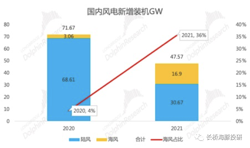 - 海风装机占比低,但发展势头惊人:2020年陆上风电新增68.61GW、海上风电新增3.06GW,海风新增装机约4%;截止2020年底陆上风电累计装机271GW、海上风电累计装机9GW,海风累计装机占比约3%。但2021年风电新增装机达到17GW,在经历2020年风电抢装透支2021年需求的情况下,海风新增装机实现了同比400%+的增长,占比达到36%,预示海风平价时代的到来,海风新增装机讲成为风电新增装机的重要增量。