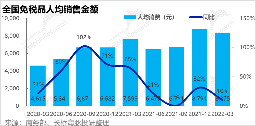 除了免税消费的总金额外,顾客人均消费金额也是关注的重点,其背后展现的是免税消费品类拓展和升级的逻辑。当前我国的免税品消费以香化类产品为主,向单价更高的皮包、首饰、手表等拓展是驱动免税品行业增长的主动力之一。但在1季度,全国免税品人均消费金额也仅同比增长10%,虽然疫情拖累或是主要原因,但市场期待的品类升级大概率也尚未到来。
