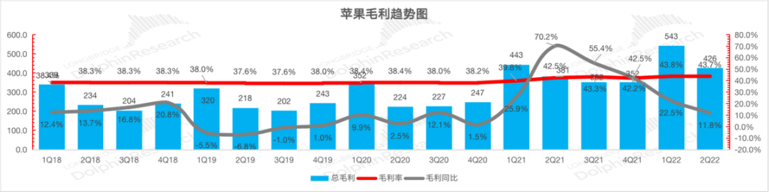 1.3 经营利润:2022财年第二季度苹果公司经营利润300亿美元,同比增长9%,超彭博一致预期(279亿美元)。经营利润的超预期表现,最主要得益于毛利率方面的超预期表现。