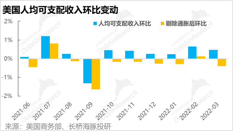 美国经济增速下滑的第一个原因即低迷的商品消费,一季度对GDP环比增长零贡献。美国商品消费增长停滞(剔除通胀后)的核心原因,还是疫情期间政府的慷慨补贴停发后,美国居民剔除通胀后的收入水平实则持续减少,收入增长乏力,消费支出也自然惨淡。
