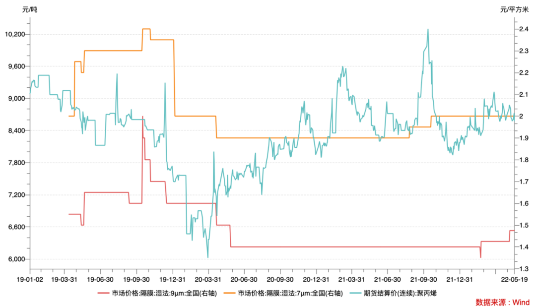 长桥海豚君曾多次提到,隔膜是动力电池及四大主材中格局最好盈利最稳定的板块,其根源在于隔膜的生产制造核心在于工艺和设备,而非原材料。并且隔膜上游原材料主要是聚乙烯、聚丙烯等化工材料,隔膜并非这些化工材料的主要下游,因此价格并不会因为新能源汽车行业的快速爆发而爆涨。在正极、负极、电解液等环节面临强大的成本压力时,隔膜却可以独善其身。